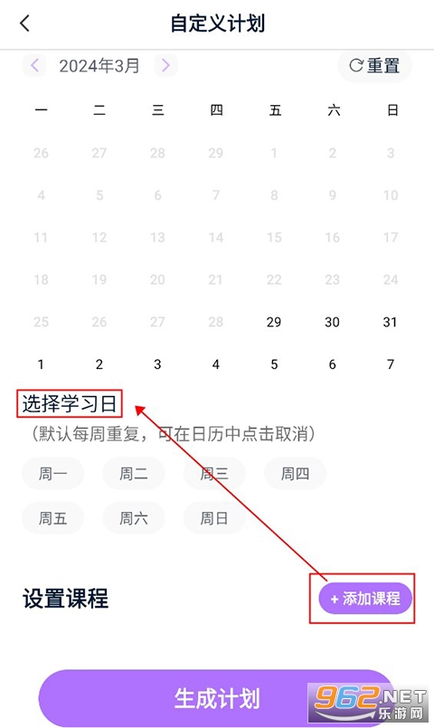 4、如果选择的是智能定制,按照课程直接就能生成,如果选择自定义用户需要选择好日期以及学习日,添加好课程点击生成即可。