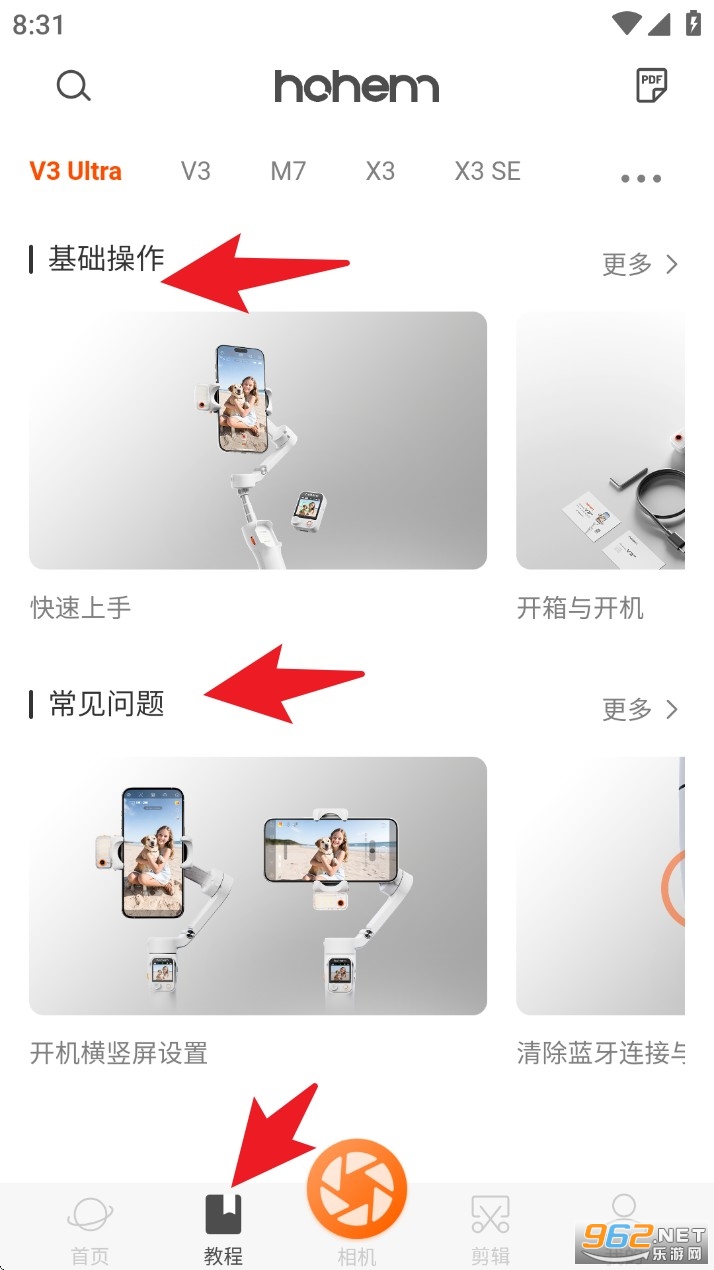 1. 点击底部导航栏的「教学」进入教学专区,可依需求选择「基础操作」或「常见问题」浏览教学内容。