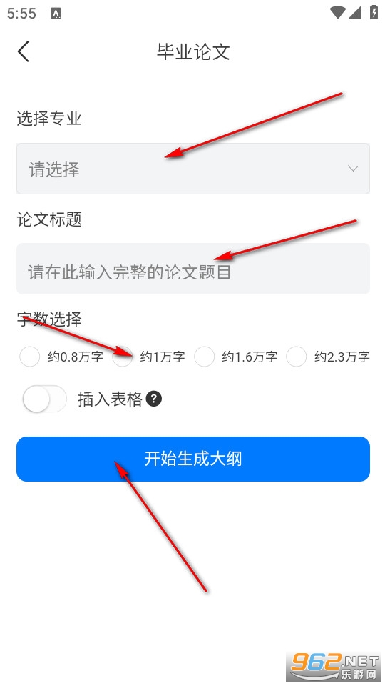 输入自己的专业以及论文需求选择,开始生成论文大纲。