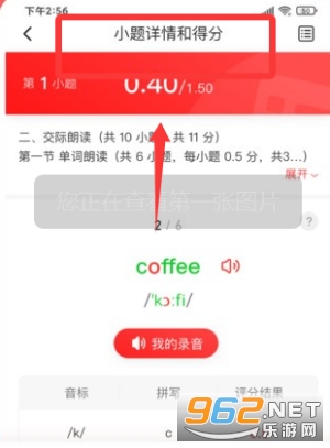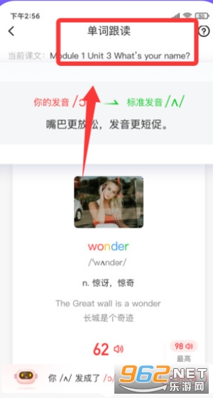 2、进入单词跟读模块,点击麦克风跟读单词,app会智能评分并纠正发音,多练几次提升口语准确度。