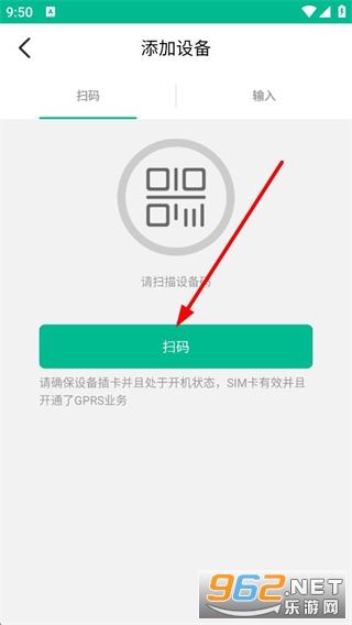 1、进入添加设备页面,默认选中扫码选项,可点击页面中的扫码按钮来扫描设备二维码,操作前需确保设备插卡开机且SIM卡有效并开通了GPRS业务。