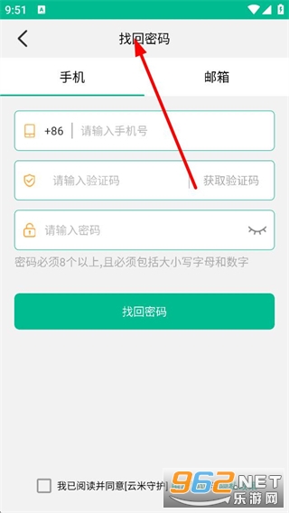 4、进入找回密码页面,选择手机方式,对应输入框填写手机号,获取并输入验证码,设置符合要求的密码,勾选协议后点击找回密码按钮。