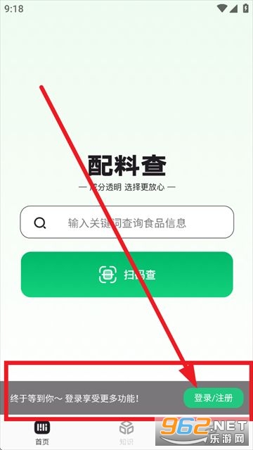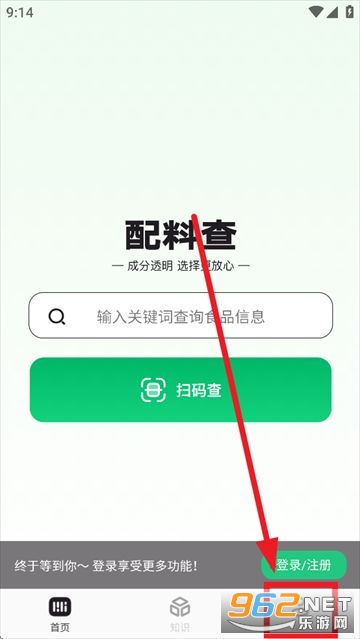 1、在本站下载安装并打开配料查app,点击下方登录/注册。