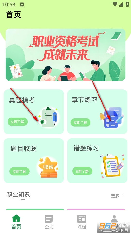 点击软件进入首页,根据自己的需求选择真题模考或者章节练习。