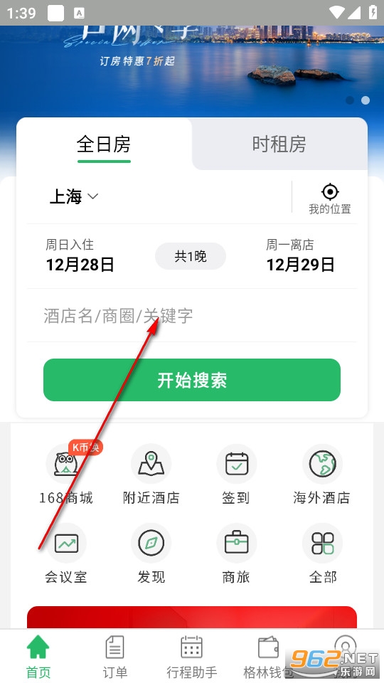 点击软件进入主页,在上方搜索栏搜索自己需要入住的酒店。