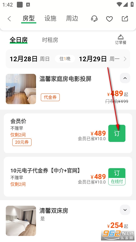 点击这些酒店进入详情页,可以了解这家酒店的基础信息以及相关客房,选择一间客房然后点击订字就能付款完成订房了。