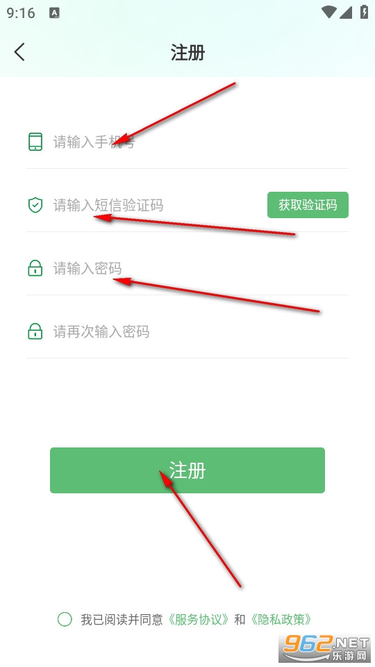 选择填写自己的手机号、验证码以及密码后点击注册即可注册成功。