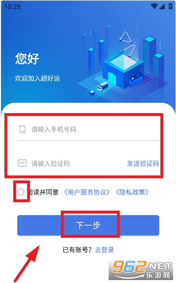 2、输入手机号,验证码,勾选阅读并同意 《用户服务协议》 《隐私政策》,点击下一步即可。