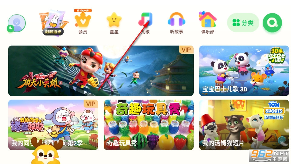 点击软件进入首页,点击上方的儿歌分区。