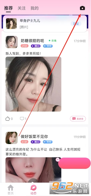 1.用户进入软件之后可以直接在动态页面中点击右上角的相机即可发布动态。