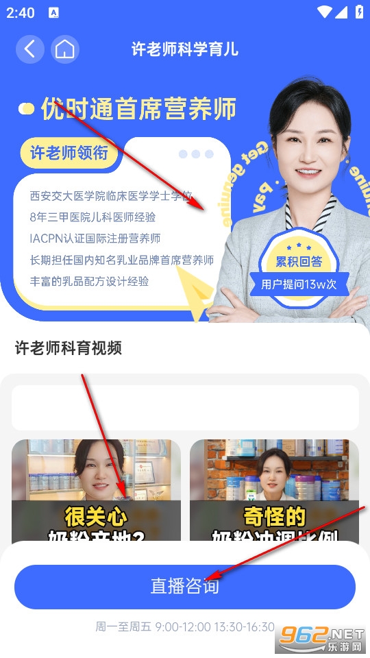我们能够在科学育儿界面选择视频进行学习,也可以选择在直播时段进行询问。