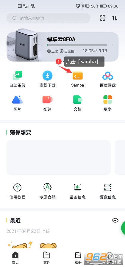 1、打开绿联云app官方版,在首页界面,点击【Samba】选项,