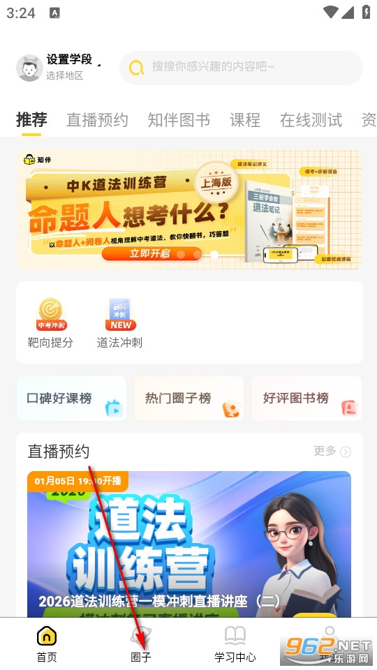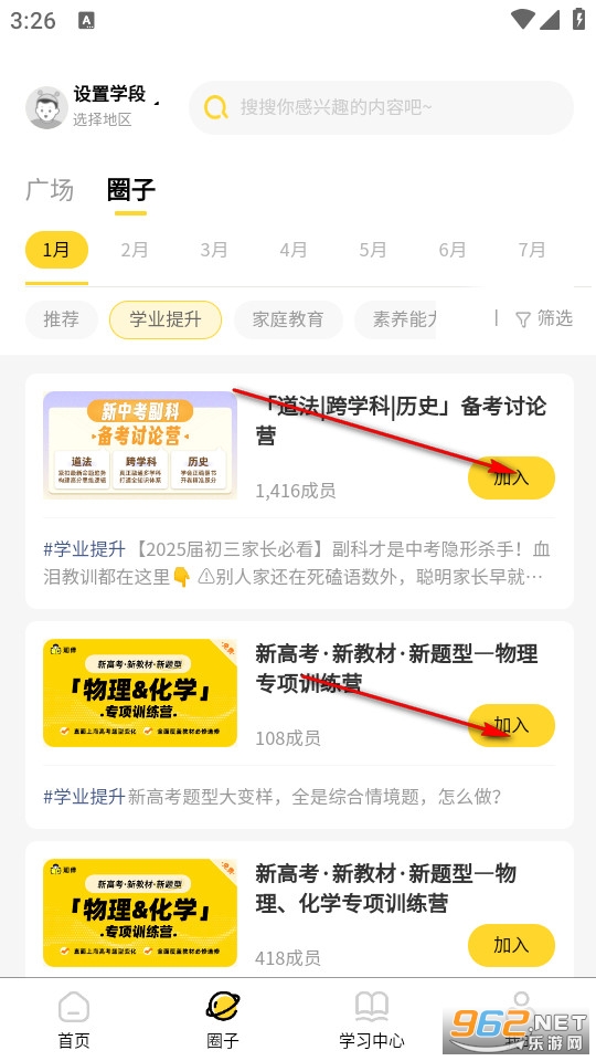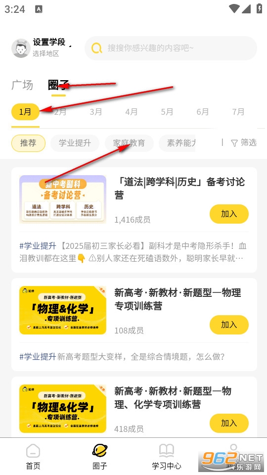 点击圈子,选择月份,然后寻找自己的学习圈子。