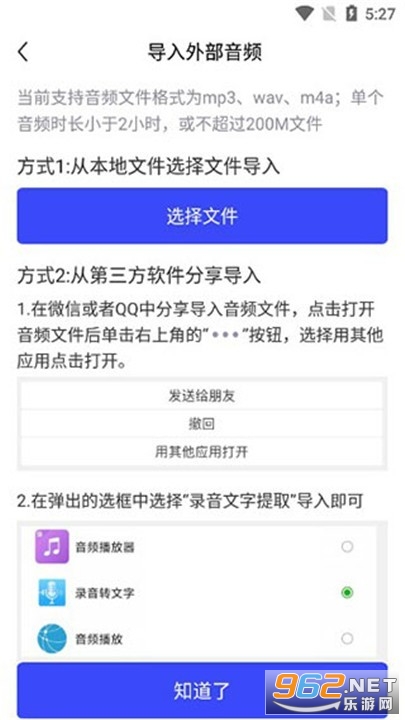 4、除了实时录音,光速录音转文字还支持导入本地存储或其他应用中的音频文件进行转写。点击界面上的“导入”按钮,选择需要转写的音频文件,软件会自动识别并转换为文字。