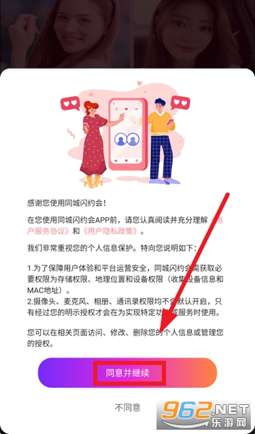 1、下载安装并打开同城闪约会app,在感谢您使用同城闪约会!提示界面点击同意并继续