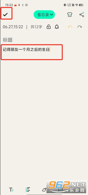 2、点击这个图标,输入备忘录内容并找到页面上的“√”