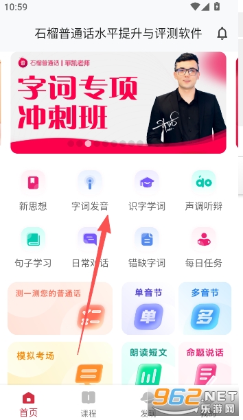 2、来到首页,可以了解并学习到普通话水平提升与评测的相关知识部分,比如字词的发音测试等。