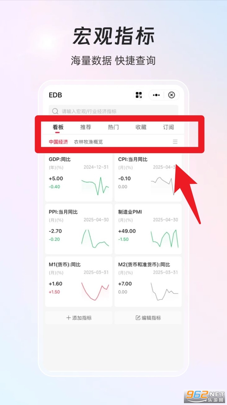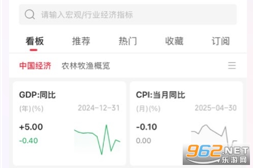 4. 点击顶部「看板」栏目,快速查阅 GDP、CPI、M2 等宏观经济指标数据,支持自由筛选主题与添加收藏常用指标。