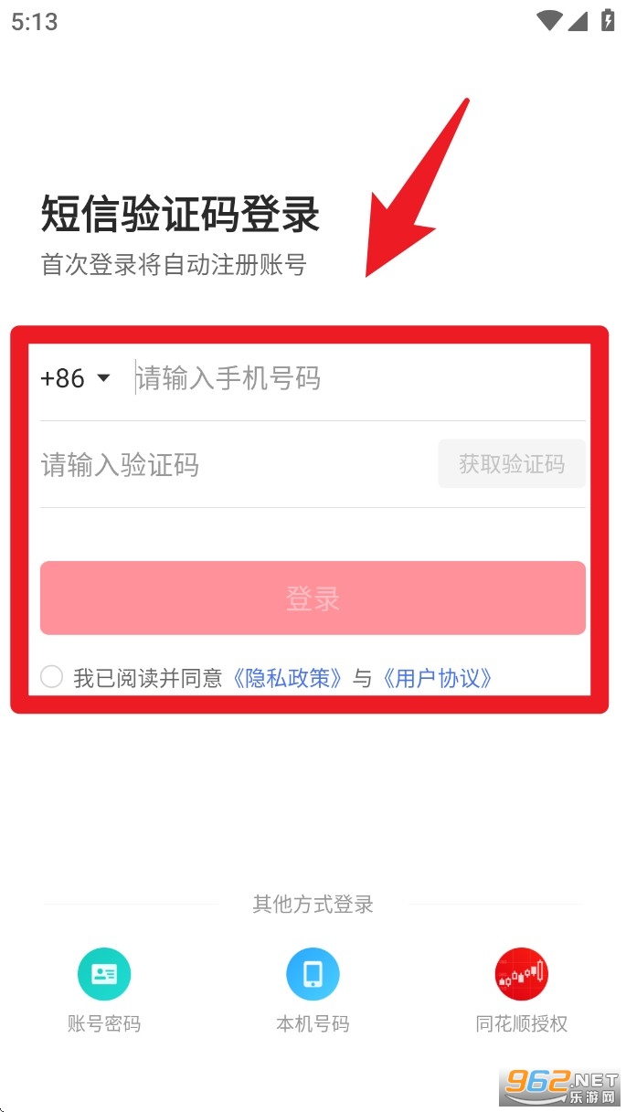 1. 打开 App 进入首页,点击「短信验证码登录」,输入手机号与验证码后勾选协议,点击下方粉色按钮即可快速登录。