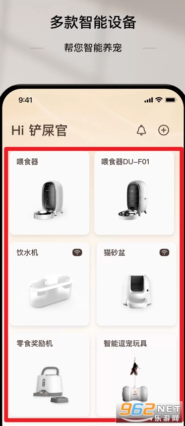 3、设备管理界面展示多种智能养宠设备,包括喂食器、饮水机、猫砂盆等,用户可随时远程控制。