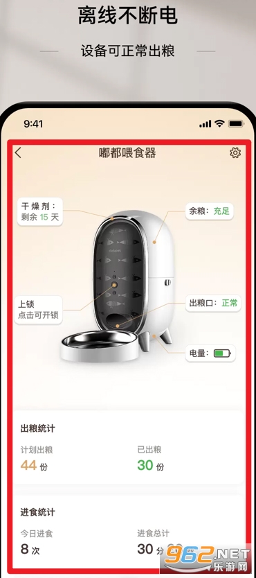 5、智能喂食器界面可查看出粮统计、进食统计及剩余粮食状态,确保宠物饮食规律与健康。