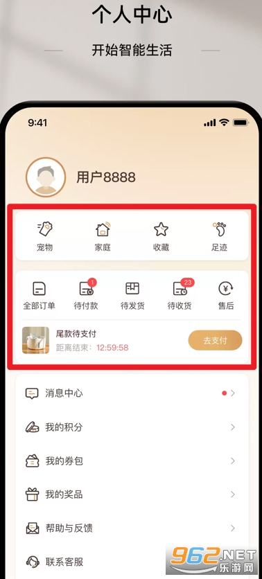 6、个人中心支持查看宠物信息、家庭管理、订单状态及售后服务,用户还能管理收藏和足迹记录。