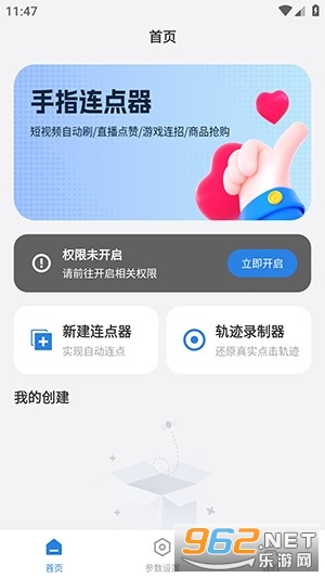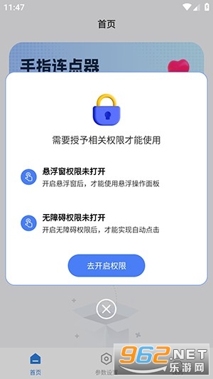 1、安装连点器app,进入软件后,先点击开启权限。开启后才可以正常使用。