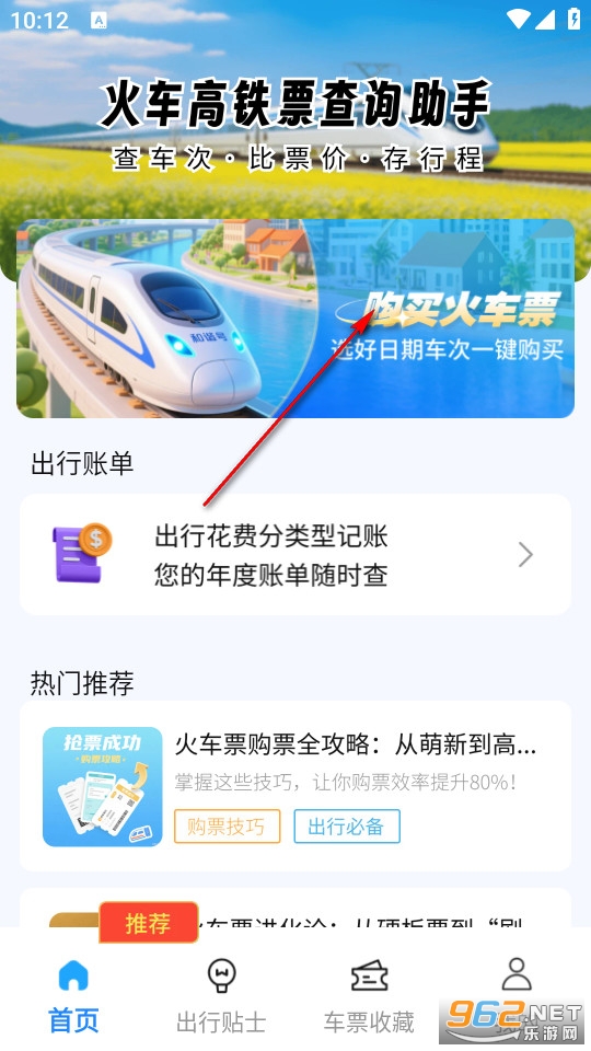 在软件首页点击上方购买火车票。