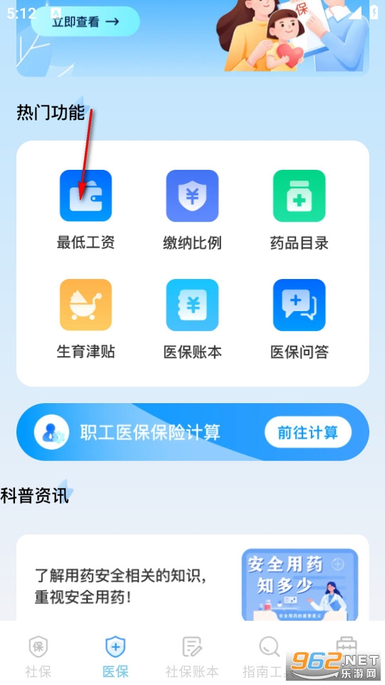 然后在医保界面的功能页选择最低工资进入查看。