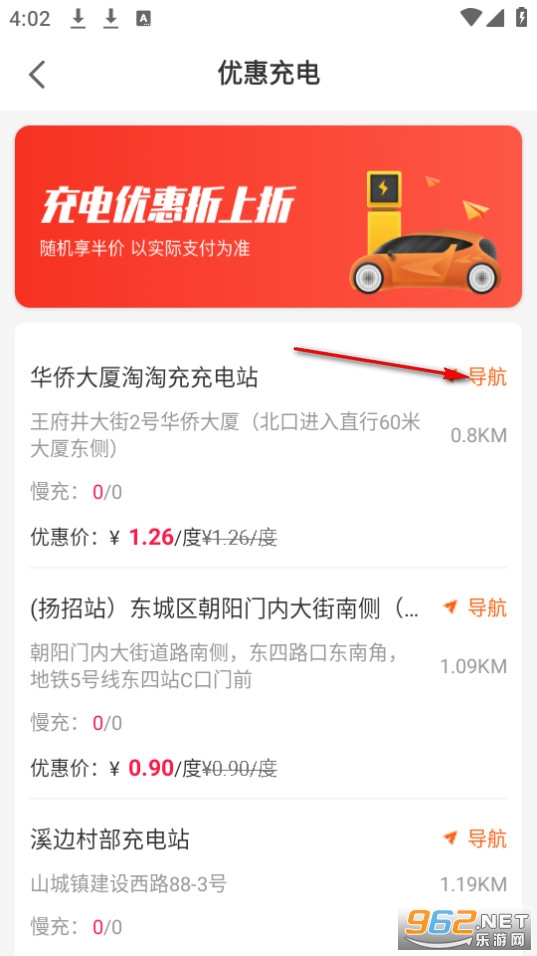 然后在充电优惠界面寻找对应的充电站并进行导航。