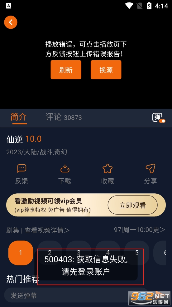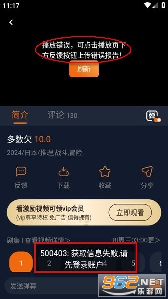 3、这边如果显示获取信息失败需要先注册登录才能观看动漫视频