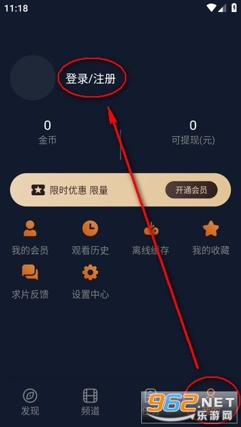进入囧次元后,点击右下角“我的”,并点击左上方的“登录/注册”;