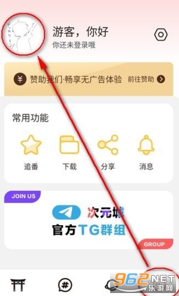 1打开次元城app,点击右下角图标,再点击“游客,你好”旁的图像