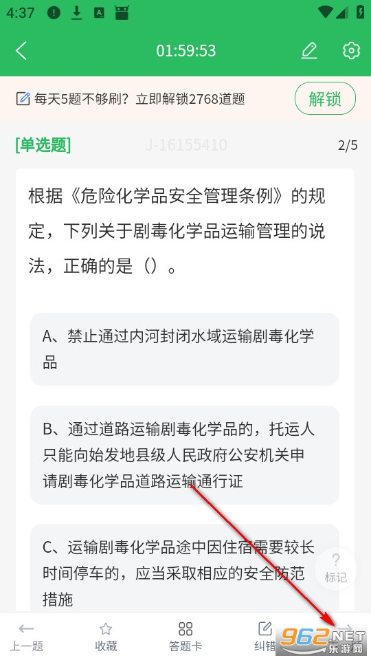 选择正确答案后点击右下角下一题。