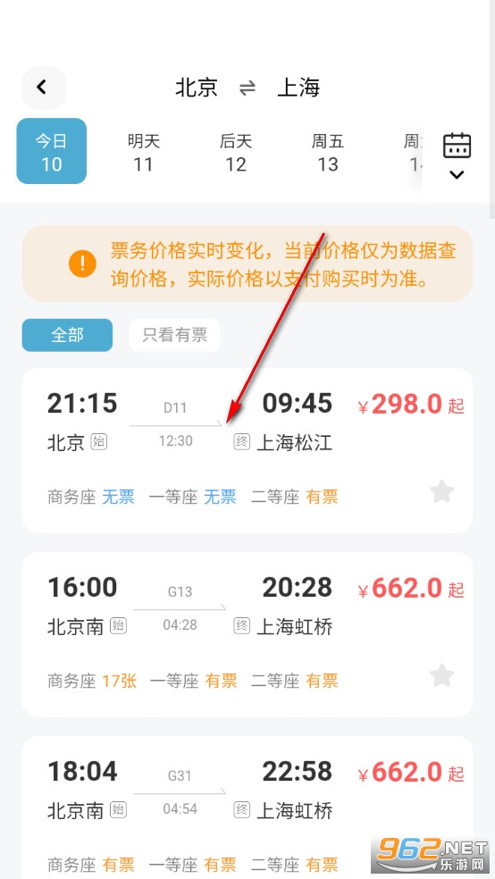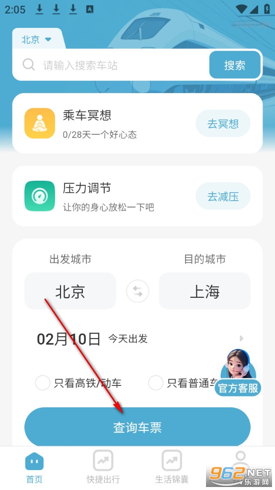 输入目的地和始发地后点击查询车票。