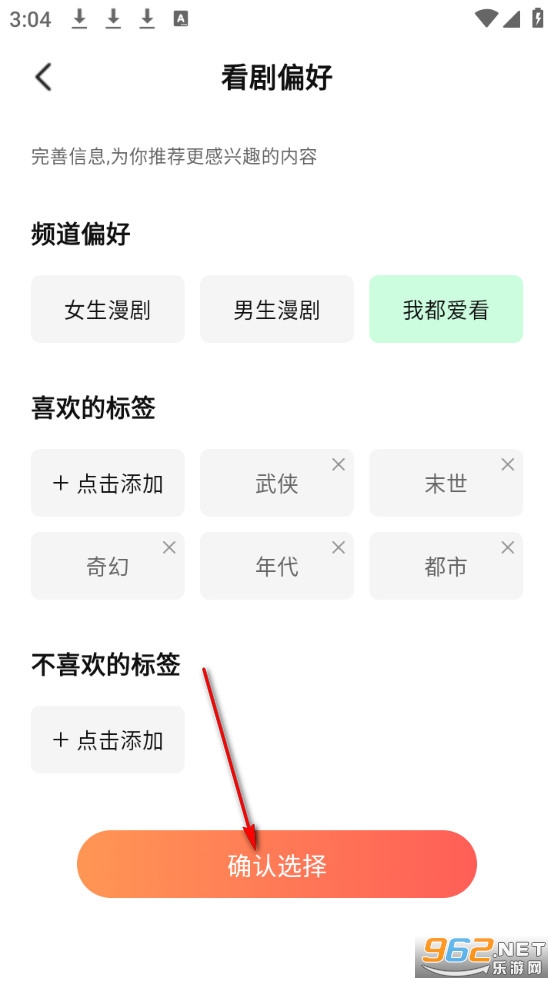 添加偏好以后点击下方确认选择。