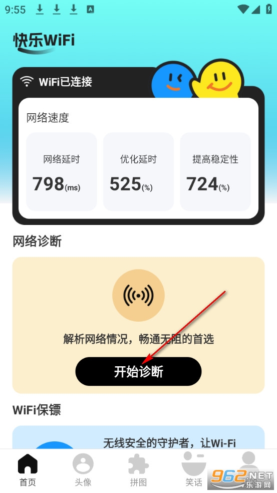《快乐WiFi》是一款专注于网络连接跟踪的检测软件,这款软件能够帮助用户进行实时网络检测,注意网络的波动,为用户提供网络诊断以及网络保护,帮助用户提高联网的稳定性,同时这款软件还支持用户进行其他趣味功能的操作使用,不仅能够帮助用户解决手机网络使用问题,还能够为用户提供不少趣味玩法。