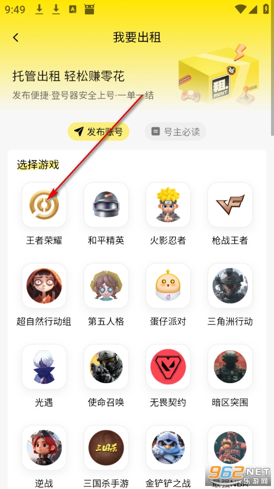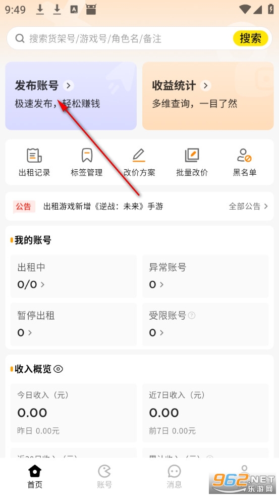 如果你曾为游戏氪了不少钱,但如今账号却闲置了,有点可惜怎么办呢。别担心!这是一款专为租号号主量身打造的账号管理平台,完美解决了游戏账号闲置的问题。该软件支持王者荣耀、和平精英、火影忍者、英雄联盟、QQ飞车等热门手游账号出租,并提供一键托管、极速上架、收益查询、极速体现等服务,整个平台界面简洁,操作便捷,收益一目了然,让你轻松管理账号,轻松赚点零花钱。