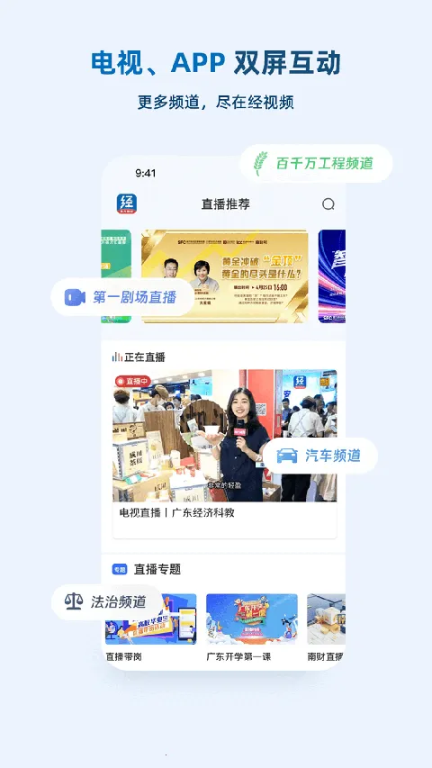经视频内容丰富,集新闻资讯、生活服务、短视频和直播于一体。有天天315等服务板块,还附带办事大厅等快捷入口。圈子互动多样,商品优质,直播新闻精彩,能智能推送热点,搜索方便,电视节目多样,体验顺畅。