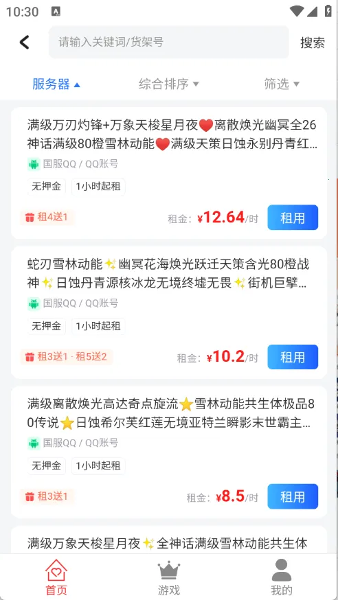 1.热门游戏租号全,一键租用超轻松。