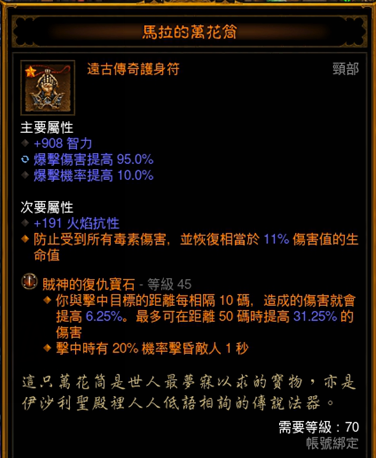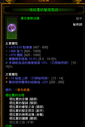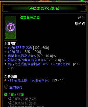 S3法师的赛季专属,远程对戒流控制的核心之一。推荐属性:火伤,智力,体力,暴击,远程减伤。