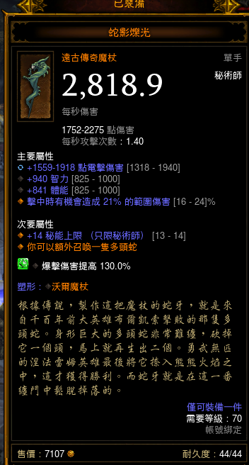 火蛇流的核心,使主力技能伤害翻倍的强力武器,火蛇上8档的关键之三。推荐属性:智力,攻速,ed,秘能上限。
