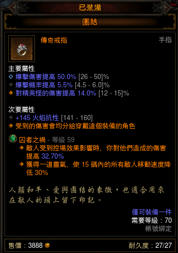 50%减伤的强力戒指,近身流高层生存的基础。推荐属性:精英伤,暴击,爆伤,孔,单抗(秘,电抗最佳)。