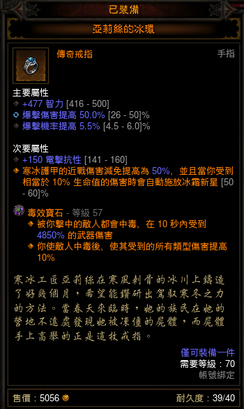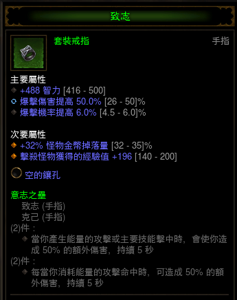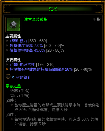 本流派的核心,鬼畜触发的冰环配合古腕可以达到敌人越多越硬的效果。推荐属性:智力,暴击,爆伤,孔,单抗(秘,电抗最佳)。