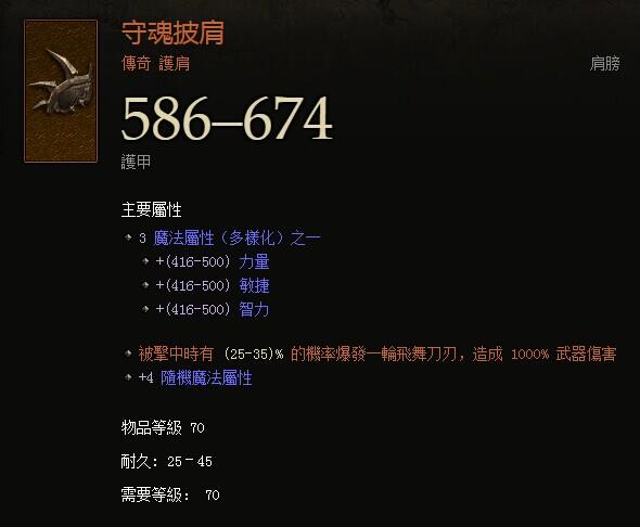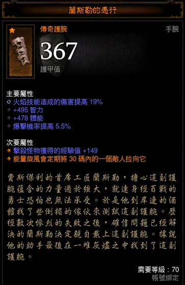 本流派的核心,由蛮子发现的强力护腕,配合冰戒可以达到敌人越多越硬的效果。推荐属性:火伤,智力,体能,暴击,远程减伤。