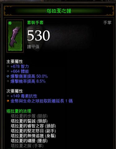 为了出全塔套效果/高层boss,毒免之流遇到纲目几乎就没有问题。推荐属性,智力,暴击,爆伤,孔,远程减伤,单抗(秘,电抗最佳)。