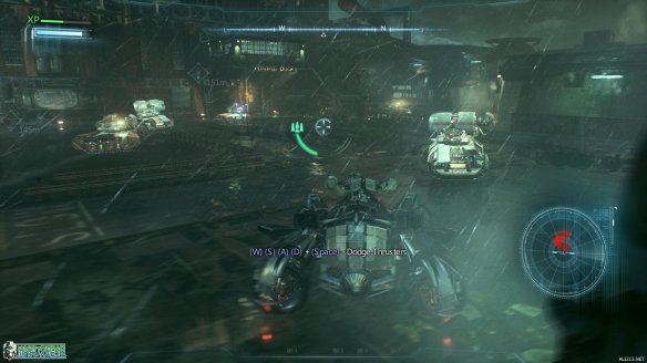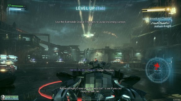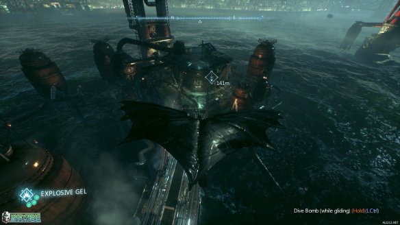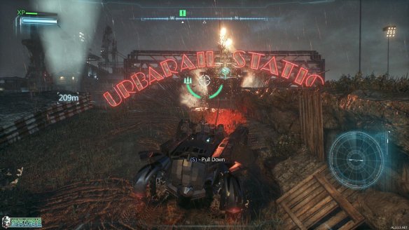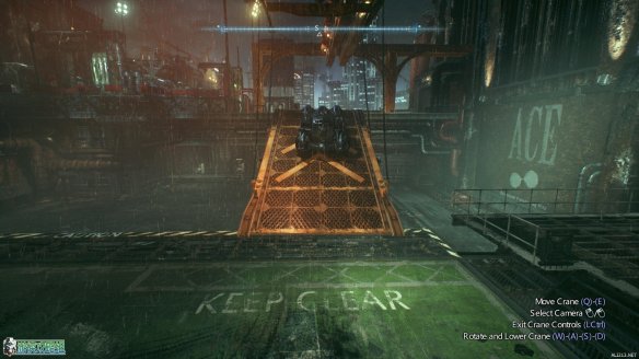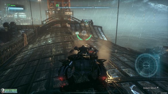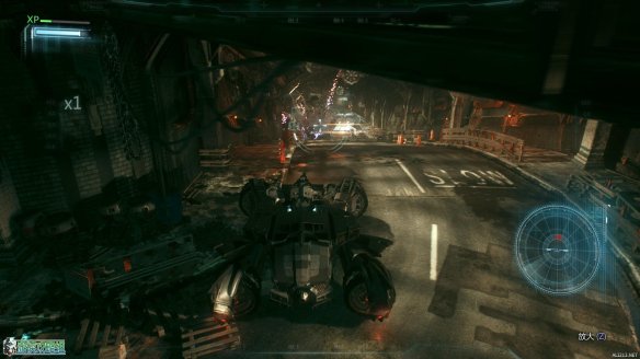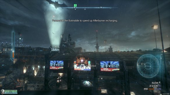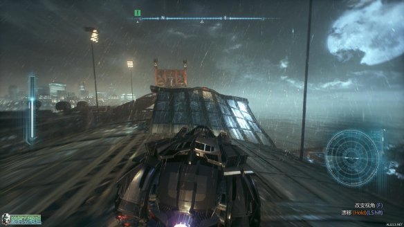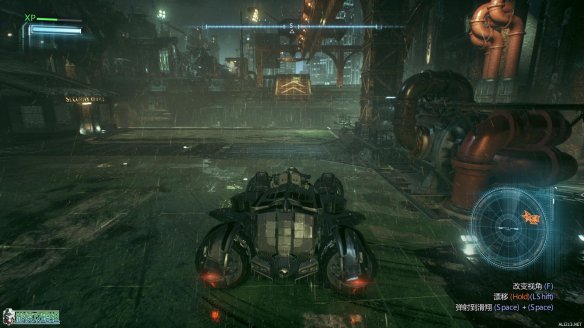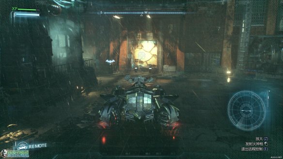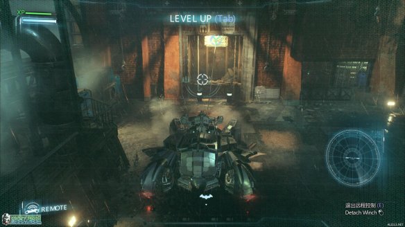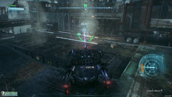 抵达标示的工业小岛上,按E来呼唤蝙蝠车。一段酷炫的动画里,蝙蝠战机为蝙蝠车装载了全新的装备:动力绞索。