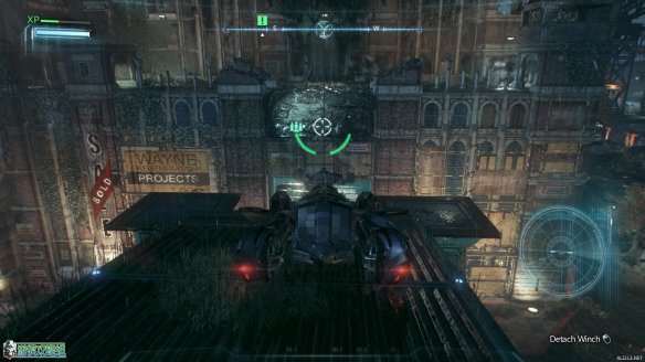 这里是一个利用蝙蝠车来解谜的游戏模式。当荧幕中出现提示时发射动力绞索来勾住对面的招牌,并且按住S来拉掉招牌。
