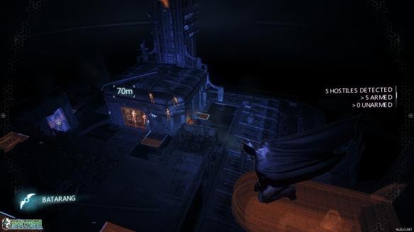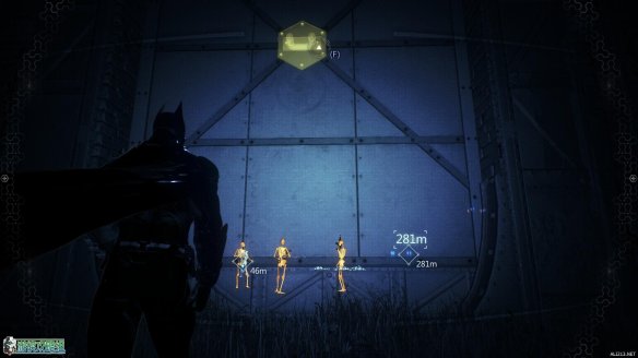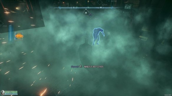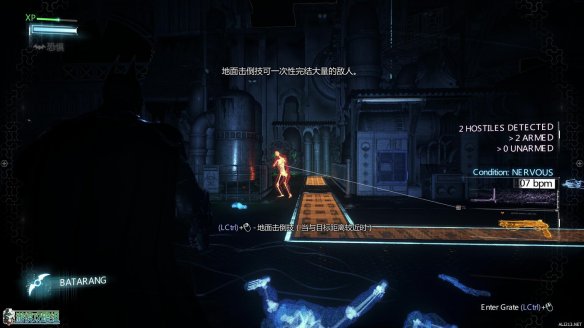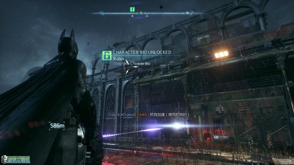 利用勾爪到达高处之后掷出蝙蝠镖,可以利用声波定位来锁定失踪员工的位置。可以标记的位置一直按住空格键即可完成锁定。