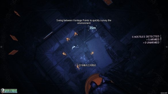 到达讯号塔之后开启侦查模式,可以发现其中有五个歹徒和一名人质。不过歹徒全部持枪,现在贸然进入并不合适。可以先利用勾爪来到鸟瞰点。